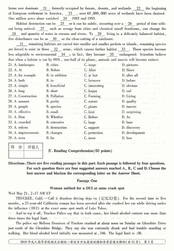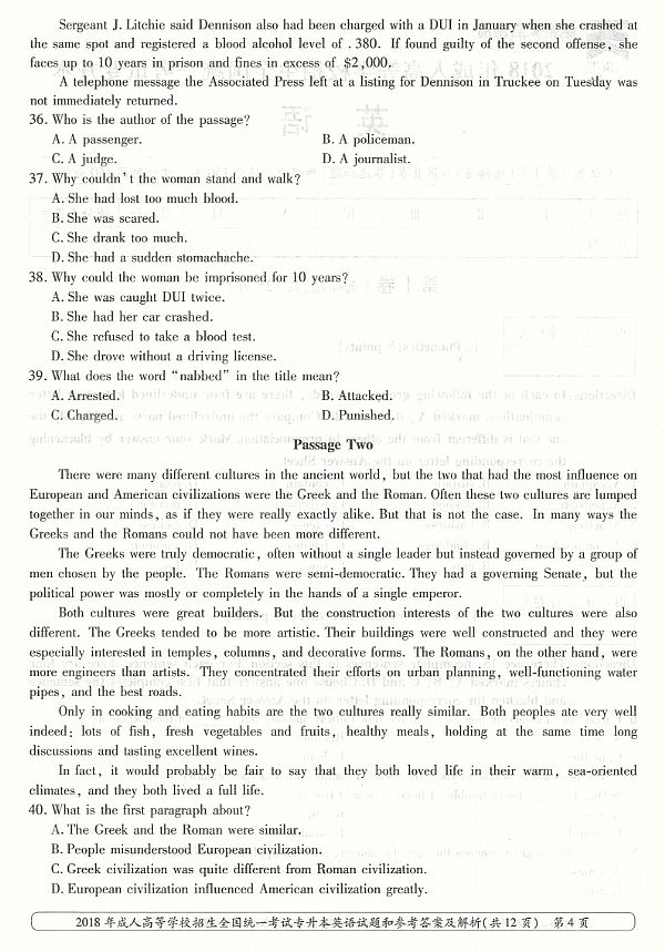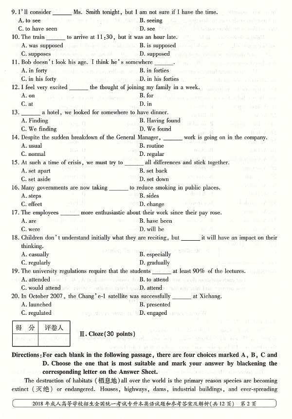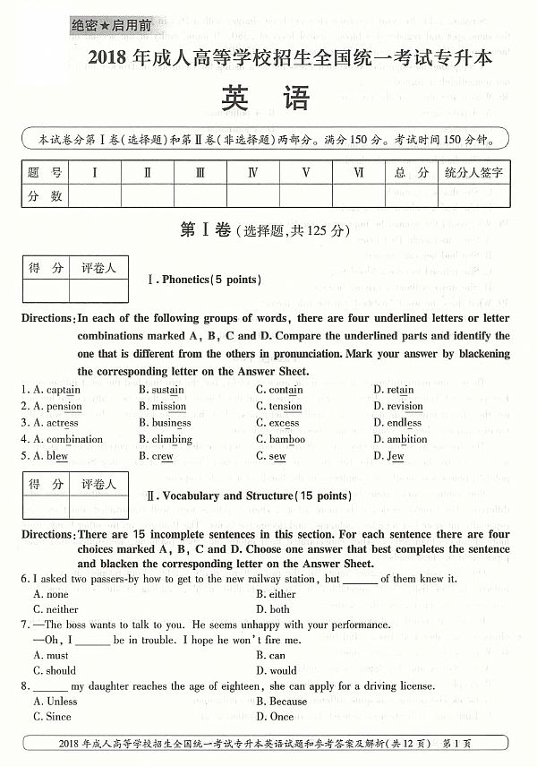 2018年成人高考专升本《英语》真题及答案