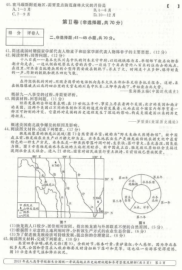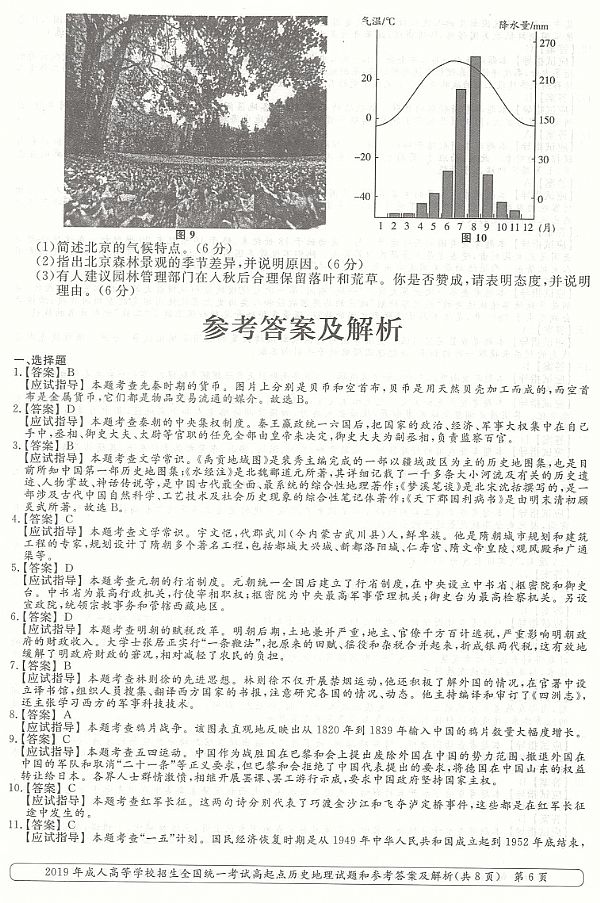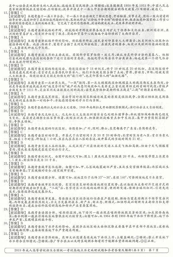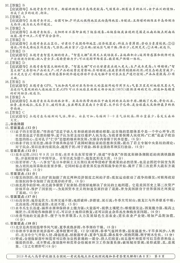 2019年成人高考高起点《历史地理综合》真题及答案